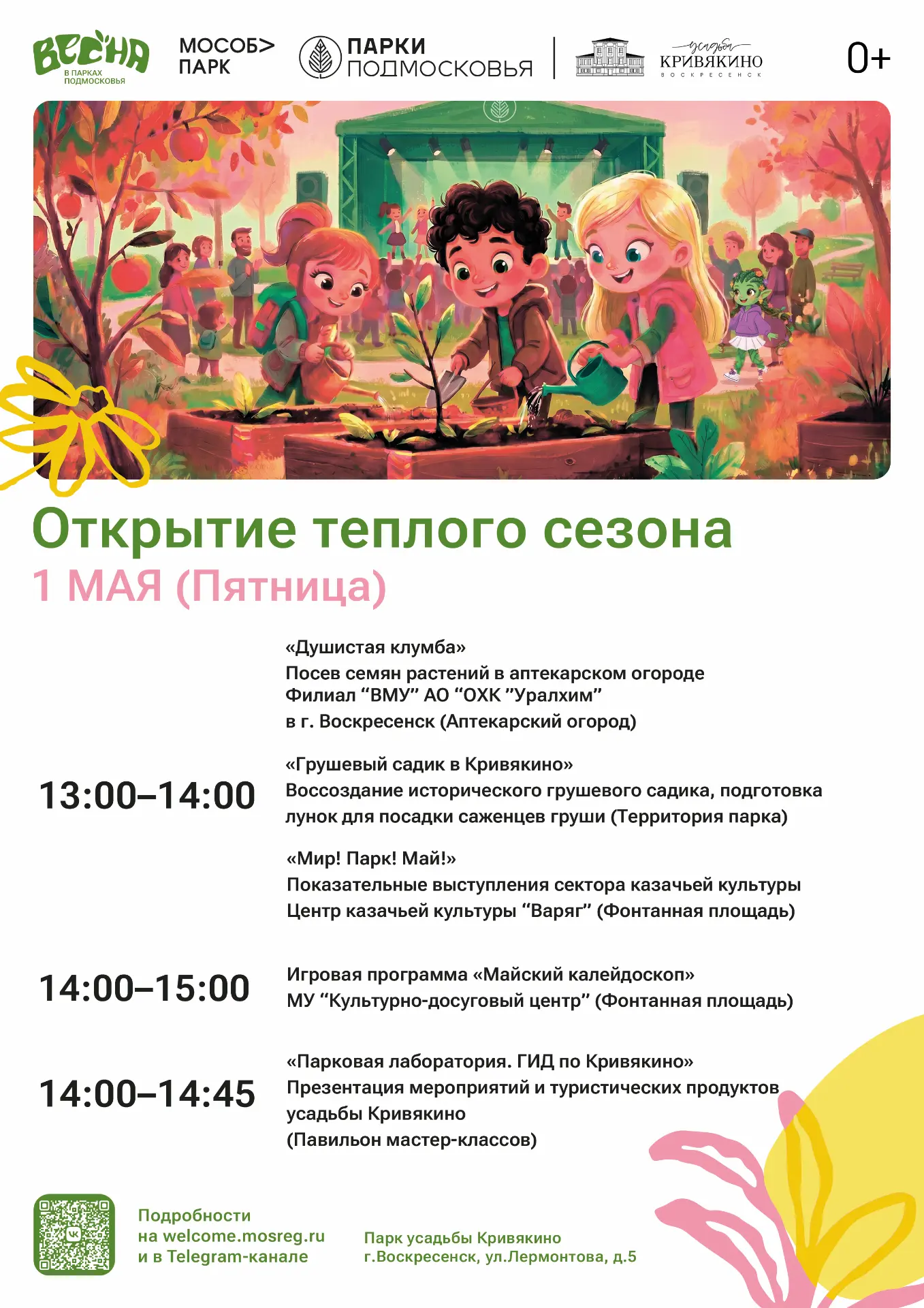 На фонтанной площади гостей ждут показательные выступления Центра казачьей культуры «Варяг», а культурно-досуговый центр проведет игровую программу. В павильоне мастер-классов пройдет презентация «Парковая лаборатория. ГИД по Кривякино», знакомящая с мероприятиями и туристическими возможностями усадьбы.