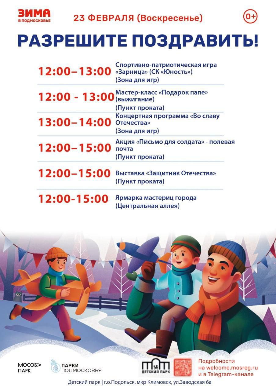 В парке культуры и отдыха имени Виктора Талалихина (Подольск, улица Рабочая, 5Б) с 12:00 до 16:00 гостей ждет насыщенная программа: выставка оружия и техники, мастер-классы по сборке-разборке автомата и по созданию открытки, ярмарка и праздничный концерт. Также в парке можно будет угоститься горячим чаем на самоварной станции, покататься на лошадях и пони и сделать красивые снимки в тематических фотозонах на память о празднике.
