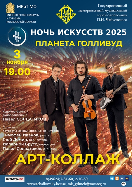Музей-заповедник П. И. Чайковского в Клину 3 ноября приглашает на концерт ансамбля Art Collage. Коллектив представит программу «Планета Голливуд», в рамках которой прозвучит музыка кино в оригинальном прочтении. Посетители услышат любимые песни и мелодии из фильмов «Титаник», «Властелин колец», «Игра престолов», «Сладкий ноябрь», «Крестный отец», «Темный рыцарь», «Интерстеллар», «Король лев», «Дюна» и других.